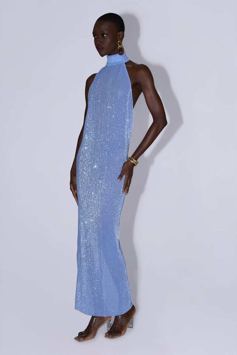 A high halter neckline draws the eye and elegantly frames the shoulders and décolletage, while the open low back adds a striking, sensual contrast. A discreet back slit allows for ease of movement without interrupting the gown’s sleek profile.
