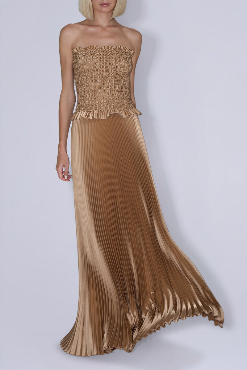 The Maya Gown is a stunning strapless dress featuring an elasticated ruched bodice that effortlessly flatters the figure. Its elegant design flows into a floor-length skirt adorned with graceful umbrella pleats, creating a sophisticated yet modern silhouette. Perfect for formal events or special occasions, this gown offers both comfort and timeless style.