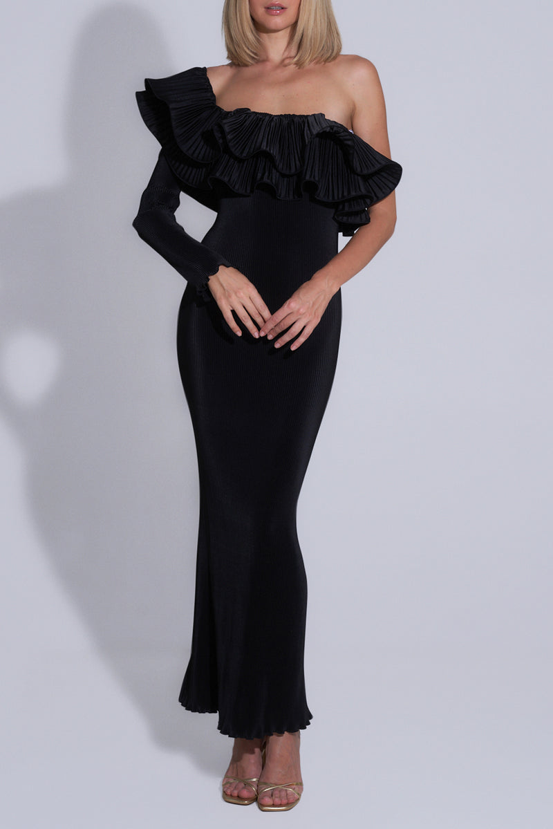 The Premiere Gown is a timelessly elegant shape that features an old air of hollywood glamour. From the one shoulder ruffled neckline to the high-shine pleats, this form-fitting statement silhouette creates a timeless look sure to turn heads.
